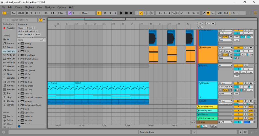 Currently I’m working on a song called (for now) “Our Painted World”. It has a very delicate feel to it, I think. Not a lot of low-end until perhaps 1/3rd of the song. I want it to feel floaty and dreamy, but also with a dance-like feel during the choruses. Something you can move like crazy to when the moment comes.